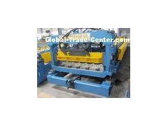 Roof tile forming machine includes in decoiler, sheet guiding equipment, covering film device, roll forming system, pressing device, post-cutting equipment, hydraulic station, electric controlling system and run out table for product.